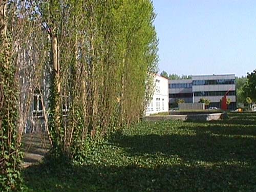The first row of poplars makes an oblique angle with the facade of the main building. The red construction can be seen on the right. The angle which the parallel rows make with the architecture results from a two dimensional sculptural element in the back of the school.
